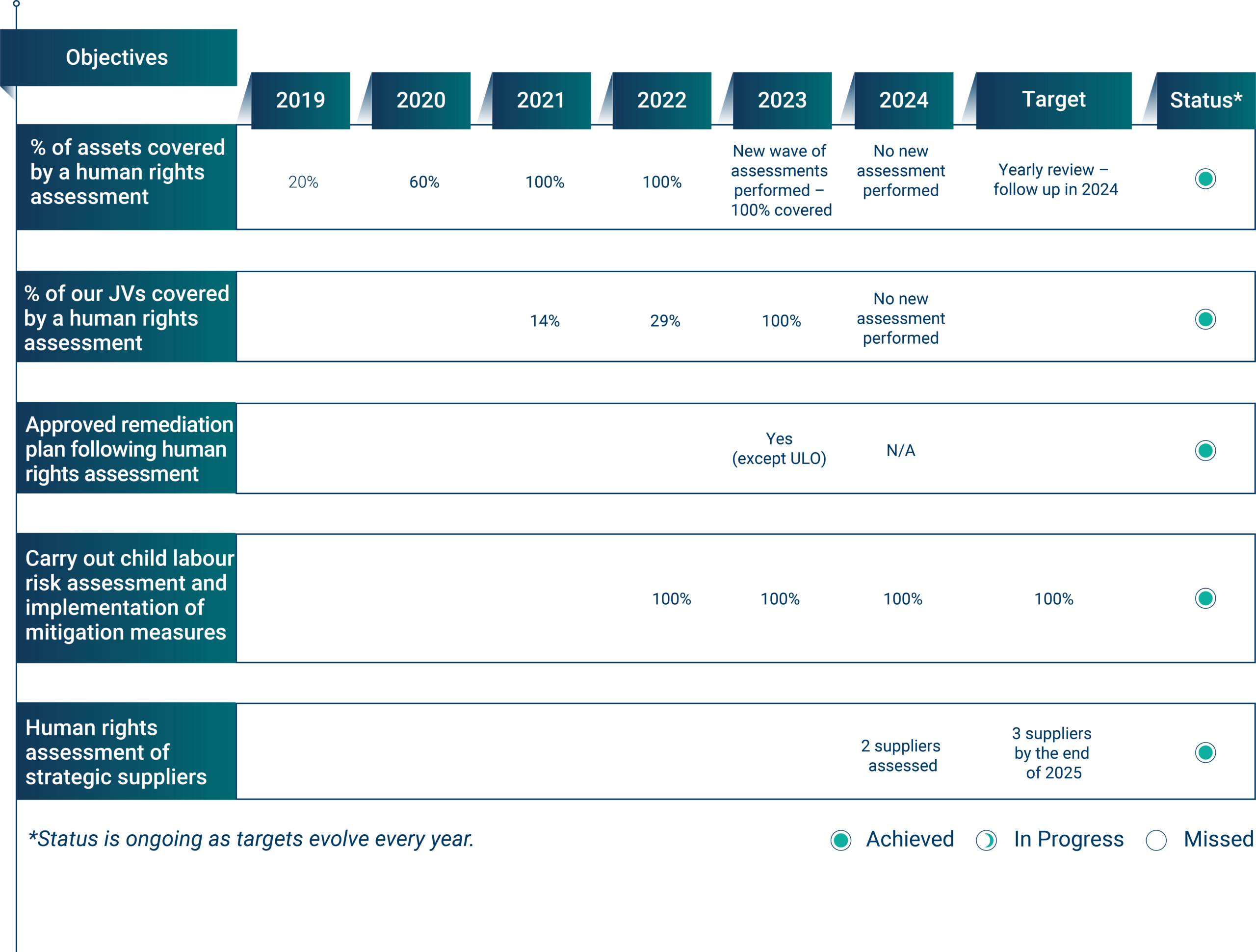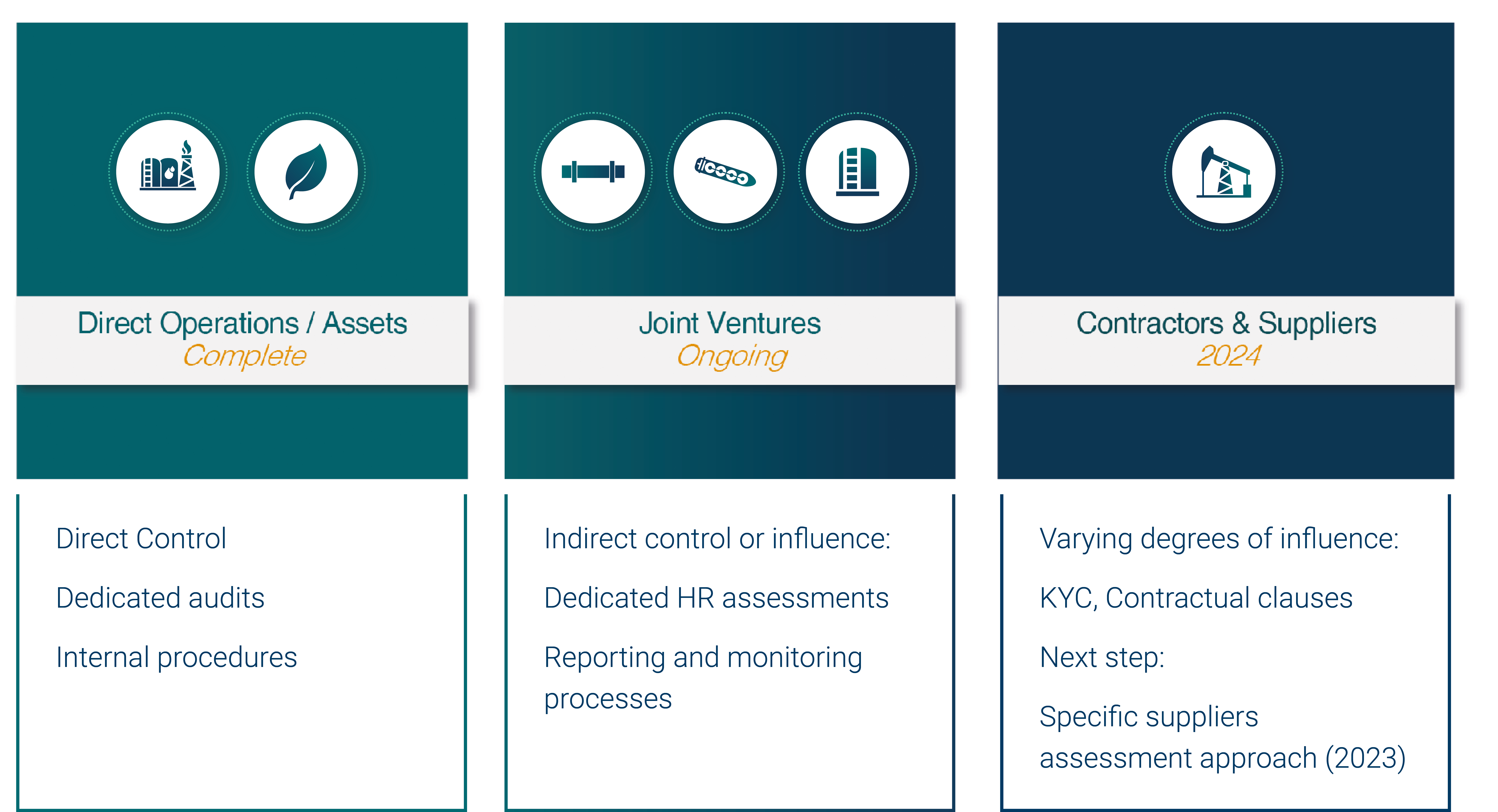 Gunvor ya ha incorporado los derechos humanos en su Código de Conducta, formación, investigación de antecedentes, conocimiento de las contrapartes (KYC) y procesos de contratación, y la empresa está trabajando para identificar, evaluar y remediar los impactos adversos en los diferentes niveles de control de sus activos y su cadena de suministro. cadena de suministro**Cadena de suministro** Una cadena de suministro es una red compleja que incluye personas, organizaciones, recursos, actividades y tecnologías que intervienen en la producción y entrega de un producto o servicio desde... Leer más. Gunvor sigue avanzando con paso firme y se mantiene en la senda de su plan definido.